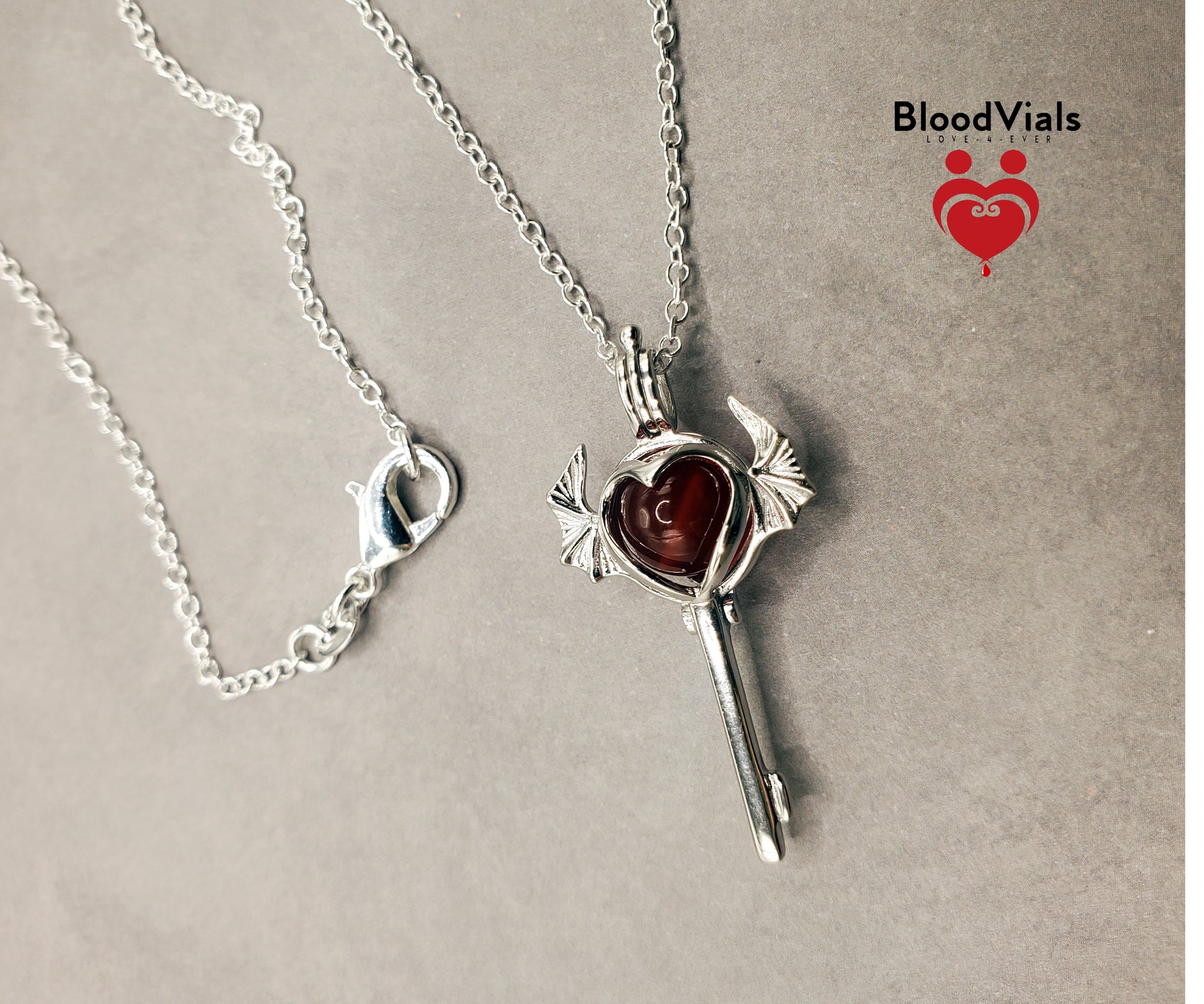 1 Sterling Bat Heart Key BloodVial Necklace Kit with 18" Long Chain Solid .925 Link Necklace (BloodBond)