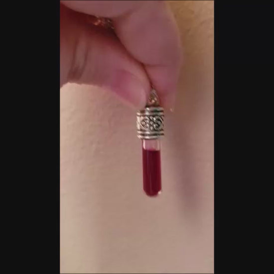 Listing is for 2 small glass vials, silvertone metal lids, and anticoagulant. Blood will darken from bright candy-apple red to a deep burgundy, like black cherries, after a few days. A color stabilizer is included, which can create a red wine hue, if desired. Once stopper is inserted, be sure to turn the vial over at least a dozen times to mix well. Glue is included and should be applied to the inside of silver cap to prevent coverage on the glass vial. Allow to set for 24 hours before wearing. These are round-bottom vials around 1.25 inches (including tops & jump rings). Two black cords and small split jump rings are included for wearing vials as a necklaces (chain not included).