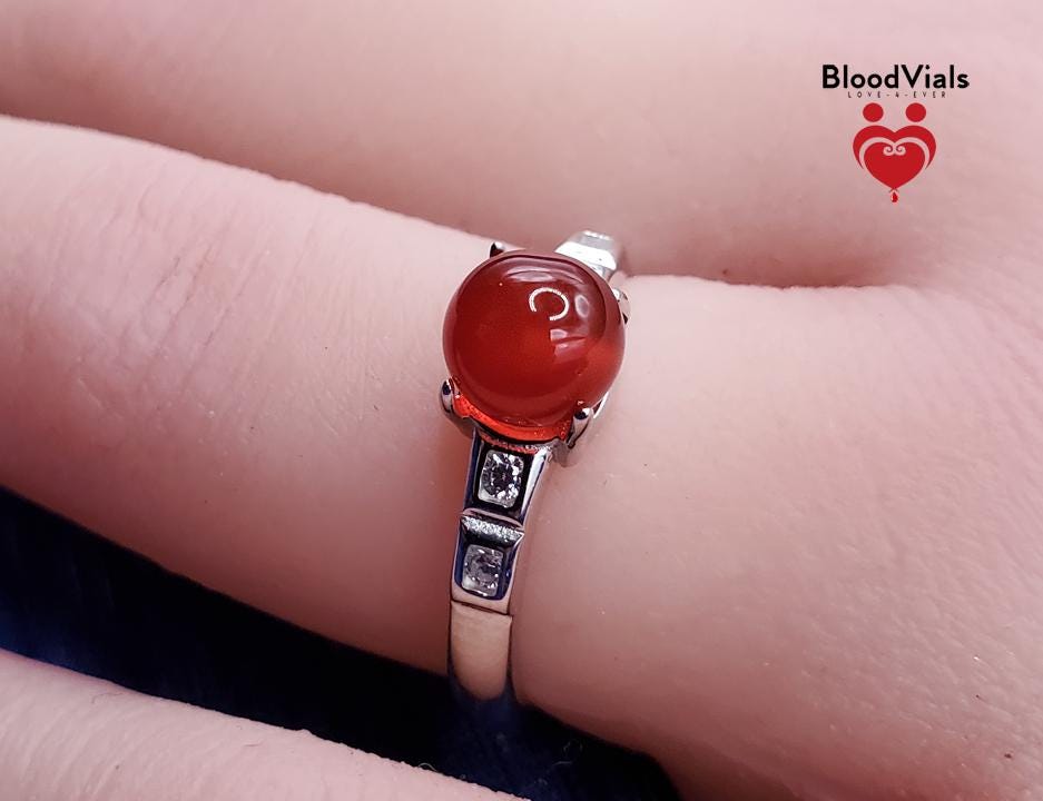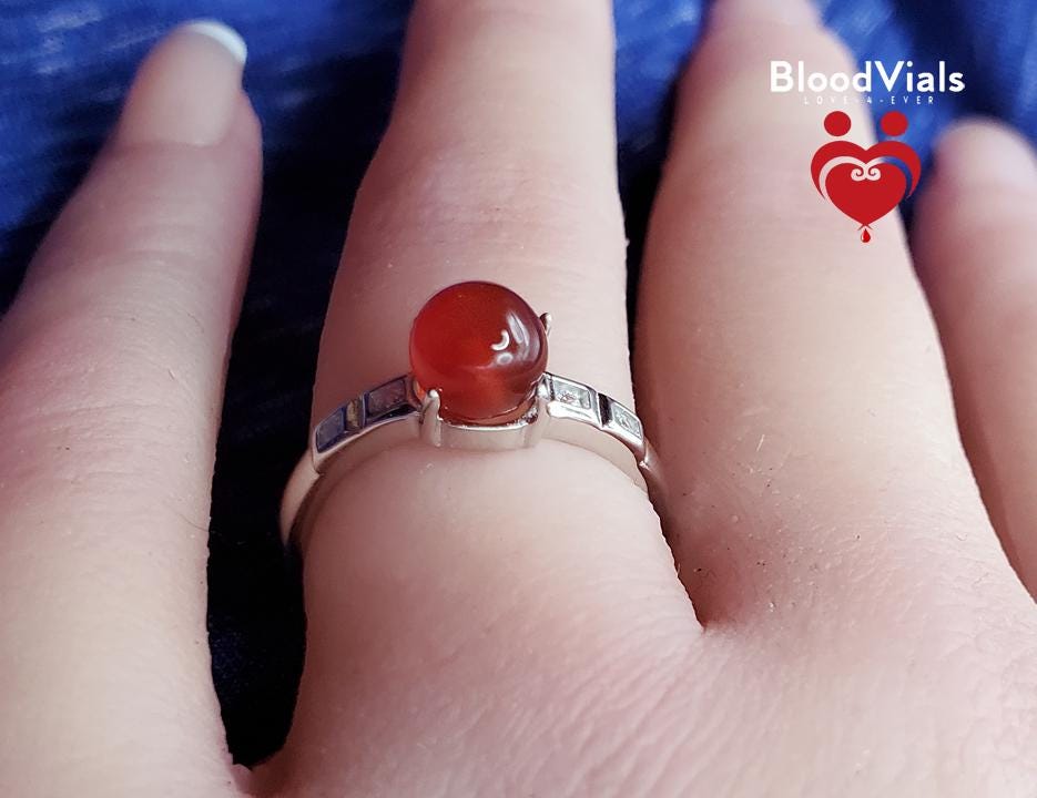 Hold a precious part of your loved one close forever. Kit includes everything you need to make your custom BloodVial jewelry, including: sterile lancet, disposable dropper, glue, toothpick, cotton swab, anticoagulant, optional color stabilizer, and step-by-step illustrated instructions. The BloodBond line of jewelry requires the smallest amount of blood. In fact, a single drop can create a stunning, wearable artwork to cherish for a lifetime. This keepsake is perfect for those who are squeamish around needles. Listing is for 1 sterling adjustable Art Deco ring with white zircons kit. Blood will darken from bright candy-apple red to a deep burgundy, like black cherries, after a few days. A color stabilizer is included, which can create a red wine hue, if desired. Once stopper is inserted, be sure to turn the vial over at least a dozen times to mix well. Glue is included and should be applied around stopper to prevent coverage on the glass vial. Allow to set for 24 hours before wearing. These are 6mm glass sphere vials. No box included. Rings are the most involved assembly of the BloodBond jewelry line. No blood is included in this listing. Customers are responsible for adding their own contents. Filling a small vial will take time and effort. Blood will separate in the beginning and settle to bottom of vial. Keep turning the vial upside-down and right-side-up until the blood and solution mix again. This will happen for a while, and then the contents will remain integrated. Keep out of reach of children and be tested for contagious diseases before use.