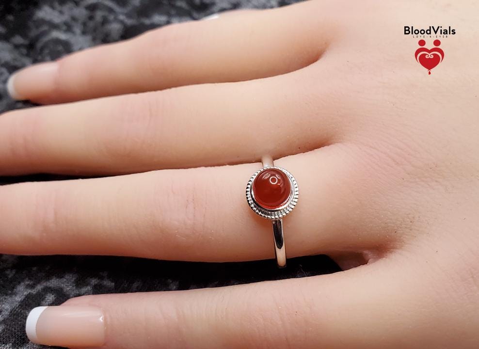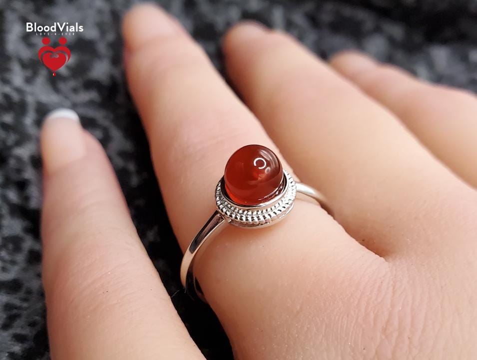 Hold a precious part of your loved one close forever. Kit includes everything you need to make your custom BloodVial jewelry, including: sterile lancet, disposable dropper, glue, toothpick, cotton swab, anticoagulant, optional color stabilizer, and step-by-step illustrated instructions. The BloodBond line of jewelry requires the smallest amount of blood. In fact, a single drop can create a stunning, wearable artwork to cherish for a lifetime. This keepsake is perfect for those who are squeamish around needles. Listing is for 1 sterling adjustable rope ring kit. Blood will darken from bright candy-apple red to a deep burgundy, like black cherries, after a few days. A color stabilizer is included, which can create a red wine hue, if desired. Once stopper is inserted, be sure to turn the vial over at least a dozen times to mix well. Glue is included and should be applied around stopper to prevent coverage on the glass vial. Allow to set for 24 hours before wearing. These are 6mm glass sphere vials. No box included. Rings are the most involved assembly of the BloodBond jewelry line. No blood is included in this listing. Customers are responsible for adding their own contents. Filling a small vial will take time and effort. Blood will separate in the beginning and settle to bottom of vial. Keep turning the vial upside-down and right-side-up until the blood and solution mix again. This will happen for a while, and then the contents will remain integrated. Keep out of reach of children and be tested for contagious diseases before use.